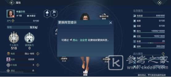 1:打开人物面板,点击阵营那栏旁边的感叹号(西山指当前阵营;冶业官是离可以换阵营的衙门最近的公交站)