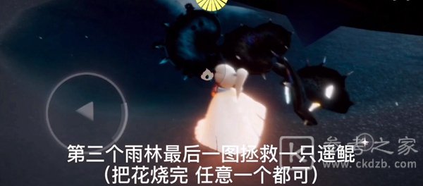 遥鲲在雨林最后一个图,被黑色的花困住的就是遥鲲,用蜡烛烧掉花就能完成