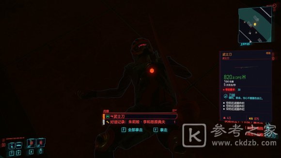 成功击杀恶原典夫赛博疯子会掉落一把武士刀,砍起人来很痛。
