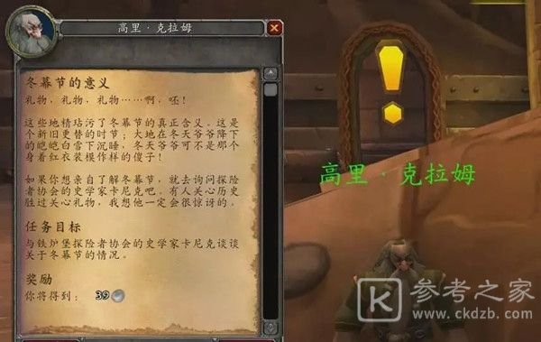 NPC会给你一个任务道具,是一本书,右键可以观看,讲述冬幕节的由来、冬天爷爷、矮人与牛头人、举办盛宴庆祝冬幕节以及一些现代习俗。