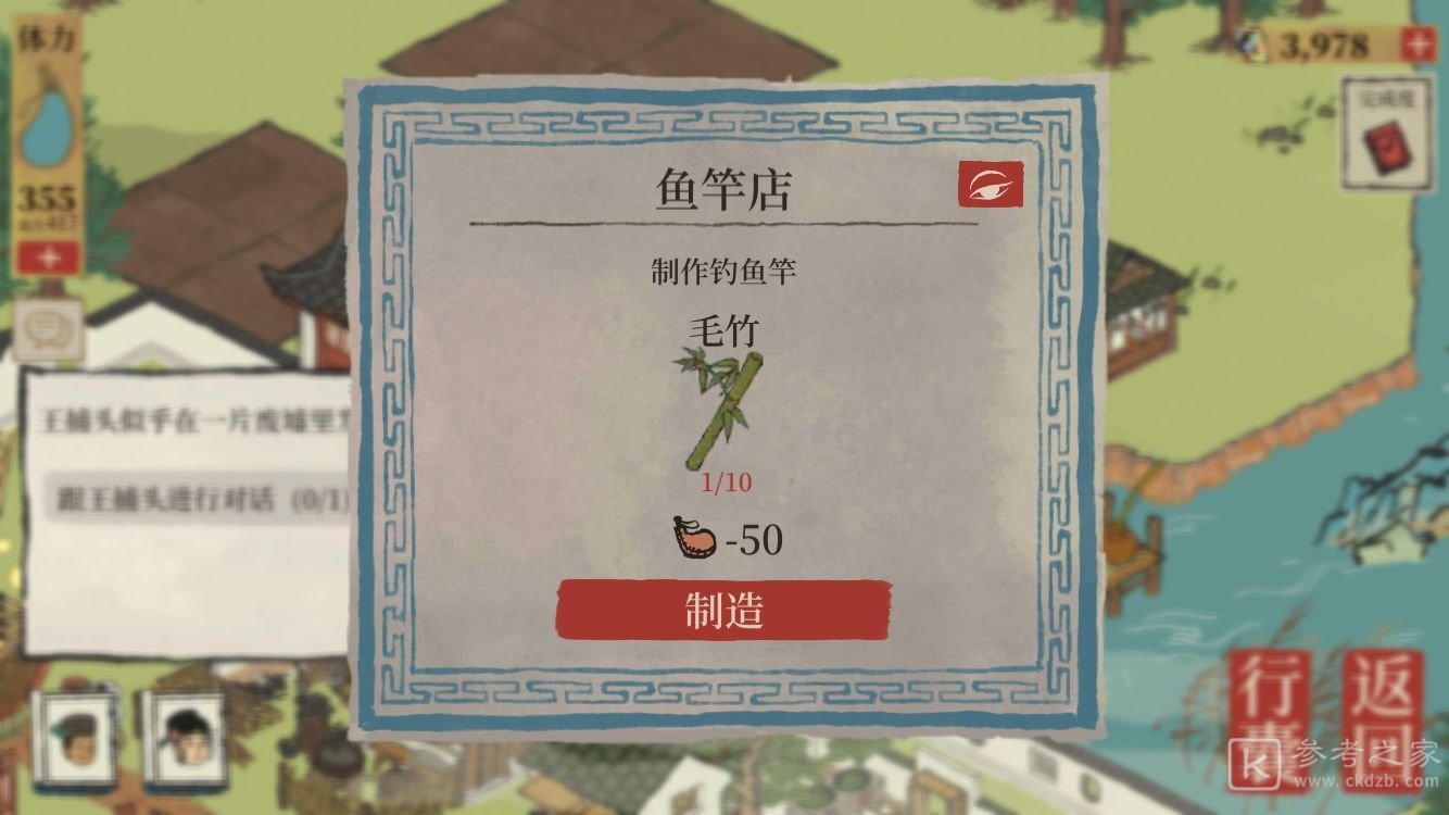 2、玩家获得毛竹之后,去到鱼竿店就可以制作出钓鱼竿,玩家一次可以制作五个钓鱼竿