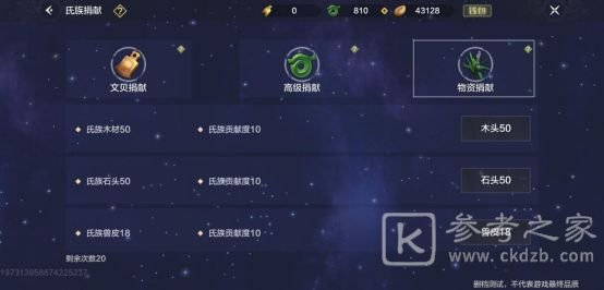 有【文贝捐献】,【高级捐献】,【物资捐献】,捐献数量不同,所得到的资金以及贡献也不同,刚开始的话还是以物资为主,多捐献的话可以制造氏族商店,工作台之类的氏族灵器。而且物资捐献的话也是比较简单的,基本都是以石头,木头,兽皮为主,不过所获得的资金以及贡献较少。