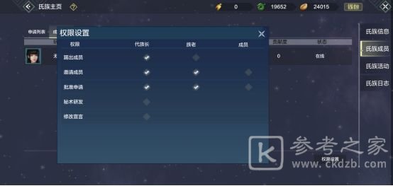 氏族成员:氏族成员可以看每一个氏族成员,而且有权限设置,可以给氏族成员委任代族长,族老,这些管理员的权限全部由族长分配(见下图)。成员列表旁边是申请列表,可以同意或者拒绝,也可以选择自动接受,这样就比较简单方便。