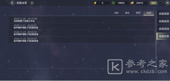 有战争,建设,事务,全部,战争属于宣战,可向敌方宣战,敌方也可向你宣战。建设属于制造,研发秘术。事务属于捐献之类的记录。全部的话就是以上所有信息的集合了。
