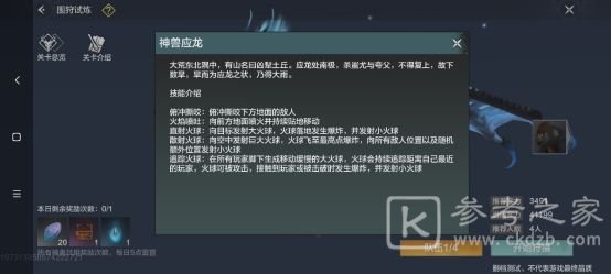 摆放好之后,有一个【入画】按钮,点击就能进入围狩图页面。在围狩图页面有四个等级不同的巨兽,分别是应龙,狌狌,萤皇和颙鸟。神兽强度随神兽开放等级提升,等级越高,奖励也越好。在页面左上角有关卡介绍,建议各位旅者进入前先看看技能介绍~