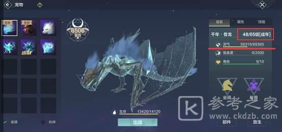 上图左边骨龙等级,左边是宠物当前等级,右边是宠物最高等级,也就是宠物灵气获取上限。目前还没有办法可以突破。