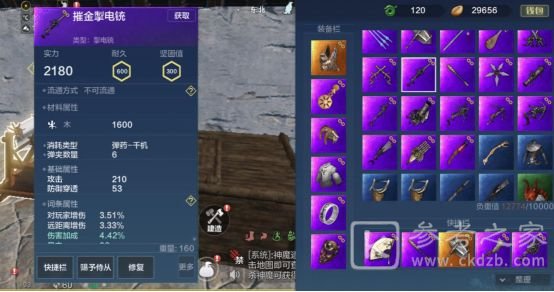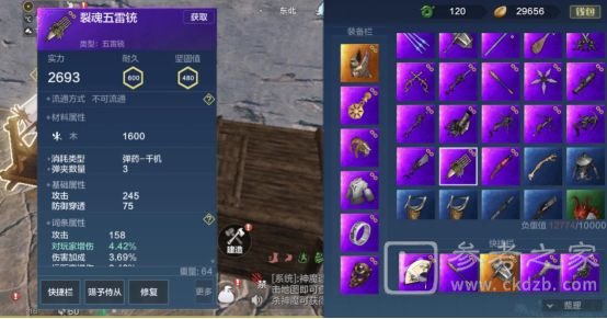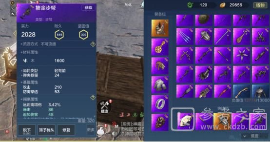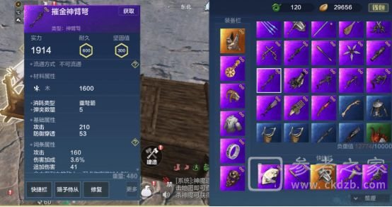 缺点:单发伤害较低,精准度不高配件搭配为弩机钩心,弩牙悬刀和桦皮箭囊