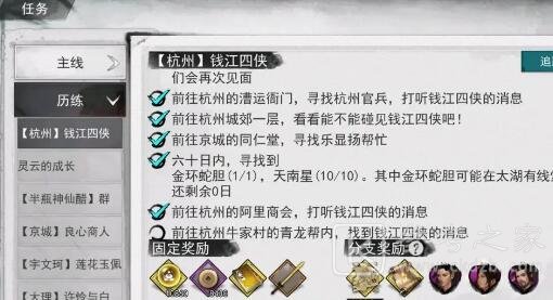 主线做到打完擂台,出去的时候四侠会叫你,然后再去城郊一的灵隐寺,对话方丈后可以触发钱江四侠任务。然后到杭州官兵继续后续任务,来到杭州一层找老妇人,老妇人有病要去京城居民区看医生,提前准备好金环蛇胆*1(武当山路、峨嵋秘境、杭州商会本杰明处购买)、天南星*10(武当山路、峨嵋秘境),再去杭州商会,在商会门口碰见商会保镖·铁手,点他选【杭州】钱江四侠,触发对话。