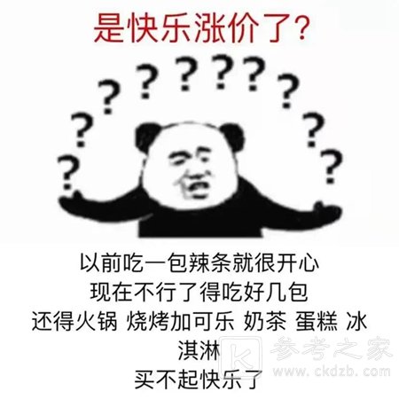是快乐涨价了?以前吃一包辣条就很开心现在不行了得吃好几包还得火锅烧烤加可乐奶茶蛋糕冰淇淋买不起快乐了
