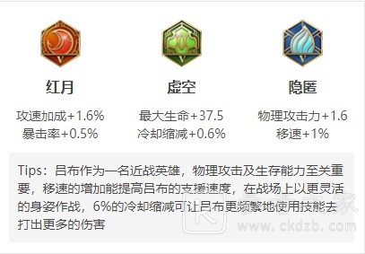 这套铭文主打高攻速,高CD和前期的生命值,高攻速前期看不出来有什么,但是吕布一旦出了破军,刀刀真实伤害,打的敌人不要不要的。高CD配合一技能和二技能,附魔和吸血都加快了许多,容错率更高。只有吕布更肉了,更容易活下来才有五杀的可能。所以说这套铭文很均衡,没有明显的短板。