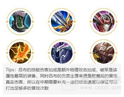 出装方面吕布的核心装备是破军,只有当吕布出了破军之后伤害才会起来。